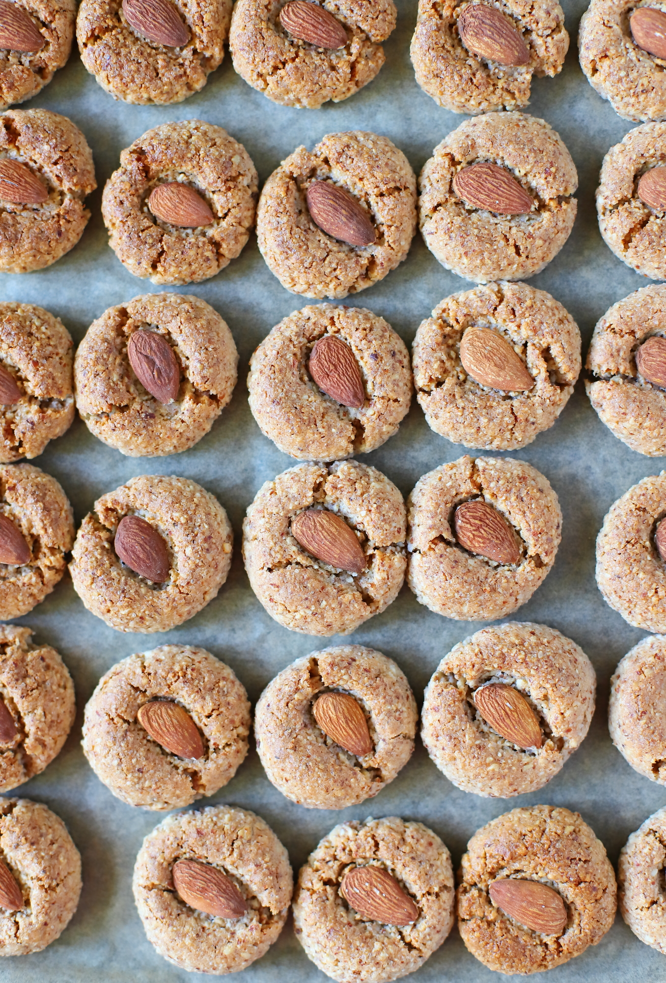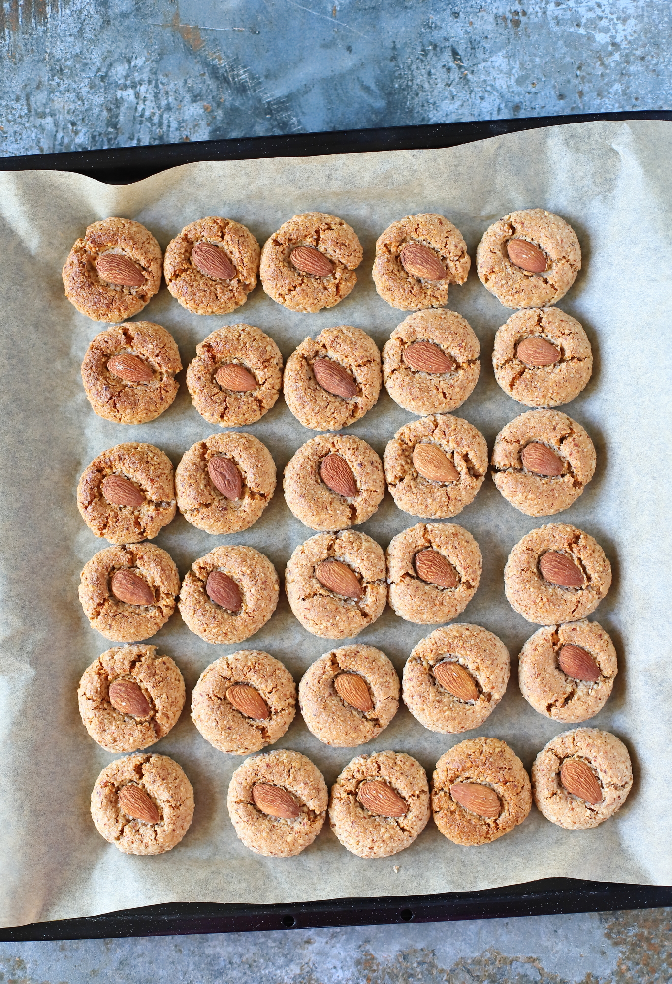- W dłoniach formuj kulki wielkości orzecha włoskiego i układaj je na blasze do pieczenia wyłożonej pergaminem, lekko dociskając. Na koniec, w każde ciastko wciśnij migdał.