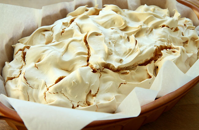 Podstawowym składnikiem Eton Mess jest beza. Każdy ma na bezę inny sposób; mnie nie przeszkadza, kiedy beza lekko zbrązowieje podczas pieczenia. Tu nie ma też problemu, gdy beza popęka, w końcu przeznaczona jest do deseru, do którego ma trafić w kawałkach. Bezę upiekłem w naczyniu do zapiekania, ale można ją także po prostu upiec na blasze. Piekłem ją na dolnym poziomie elektrycznego piekarnika (górna grzałka), rozgrzanego do 150 stopni, przez dwie godziny, po czym pozostawiłem ją w piekarniku do całkowitego ostygnięcia. Bezę można przygotować wcześniej i podać w postaci deseru dzień czy dwa później.