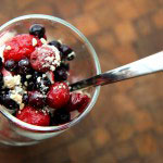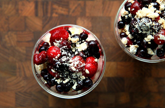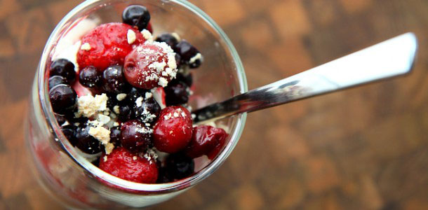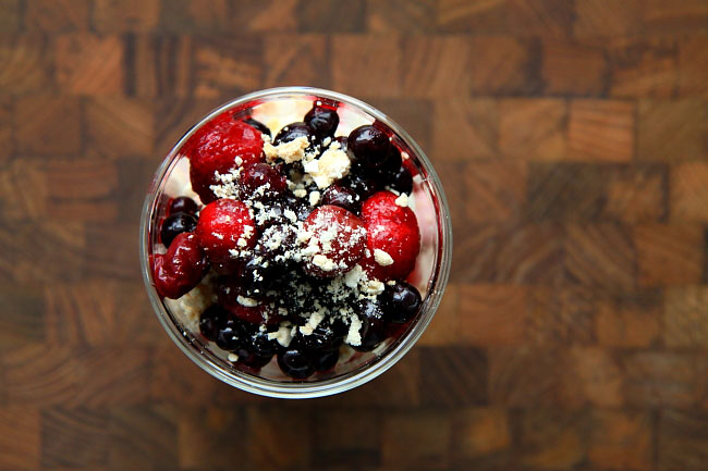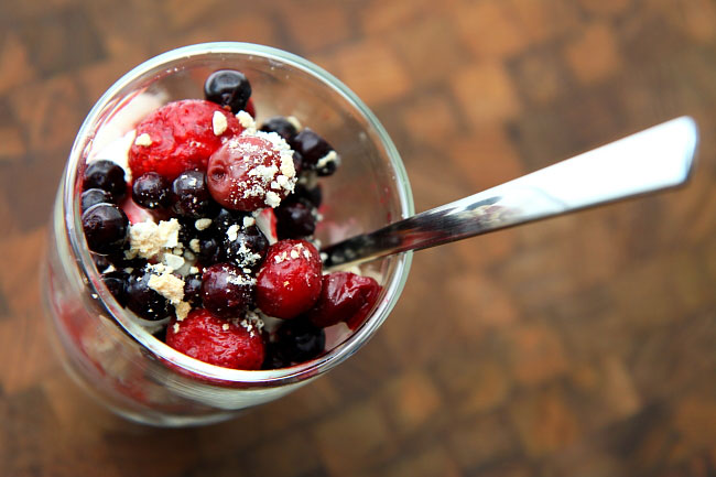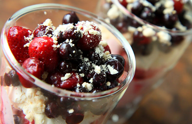Opisany niżej przepis to moja wersja Eton Mess, w którym bitą śmietanę zastąpiłem lekko napowietrzonym jogurtem. Jest środek zimy, w związku z czym świeże owoce zastąpiłem mrożonymi (mieszanka: truskawki, wiśnie, czarna porzeczka). Nie jestem zwolennikiem mrożonek, używam ich tylko wtedy, kiedy nie mam innego wyjścia, ale mrożone owoce dobrze sprawdzają się na przykład w koktajlach.