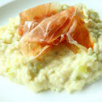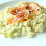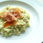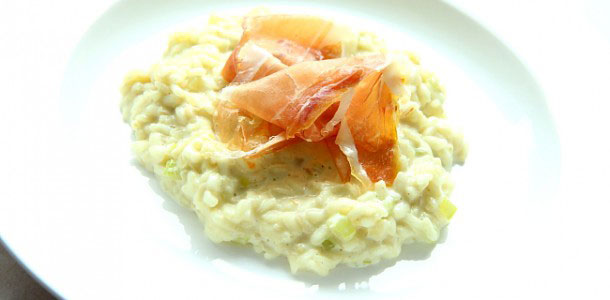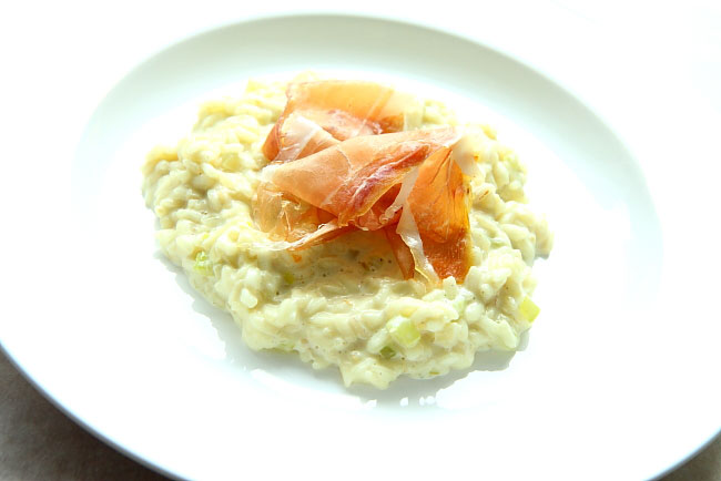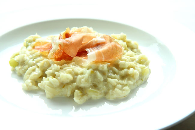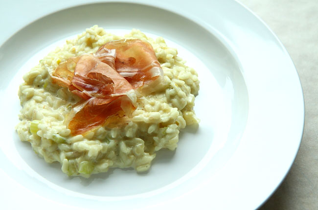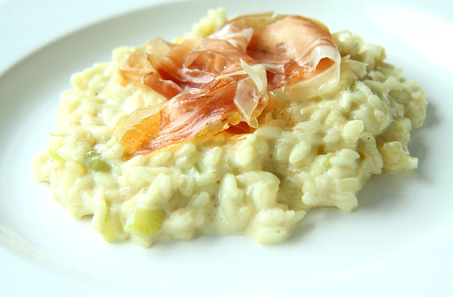 Ten przepis, który podpatrzyłem u Rose Gray i Ruth Rogers, to sposób na przygotowanie ascetycznego, najprostszego białego risotto, świetnie łączącego bulion i mleko. Bulion wlewany na początek zastępuje wino, a mleko dodaje daniu dodatkowej kremowości i delikatności. Wisienką na torcie jest tu prosciutto. Bardzo cienko pokrojone plasterki podgrzeją się pod wpływem ciepła ryżu na tyle, że tłuszcz zacznie się delikatnie wytapiać i doda potrawie dodatkowej, fantastycznej nuty smakowej.