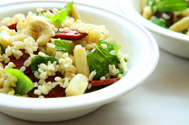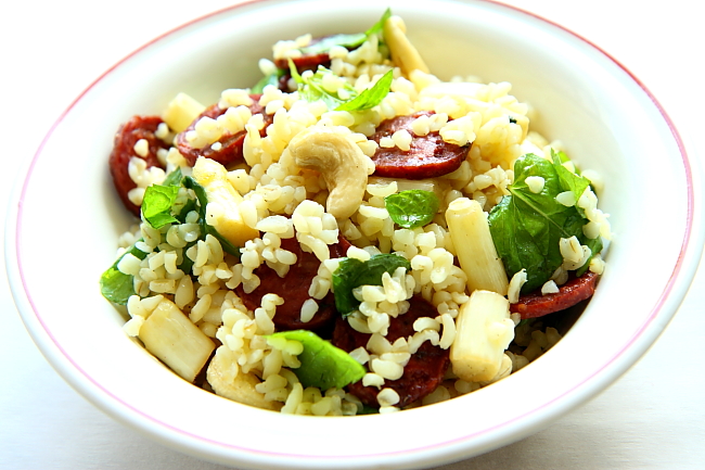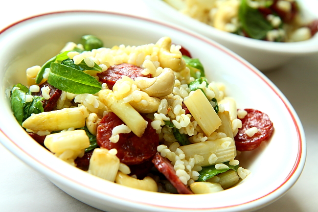 4. Na wytopionym z kiełbasy tłuszczu podsmaż szparagi pokrojone na kawałki – w zależności od grubości – wielkości mniej więcej połowy kciuka. Nie smaż szparagów zbyt długo, wystarczy dosłownie kilka minut, by stały się miękkie i sprężyste. Gotowe szparagi przełóż do miski z kaszą.