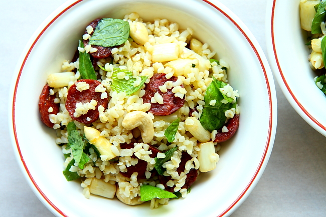 3. Zdejmij kiełbasę z patelni (jeśli chcesz, odsącz ją z tłuszczu na papierowym ręczniku) i dodaj do bulguru.