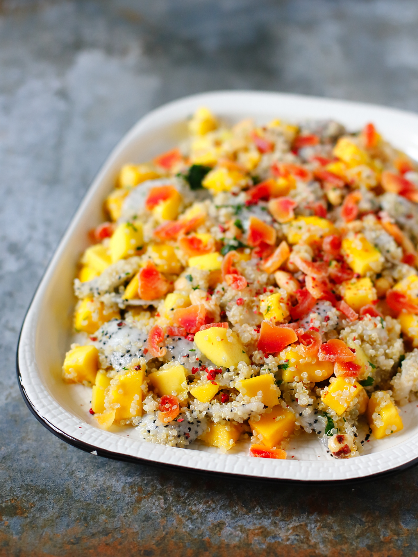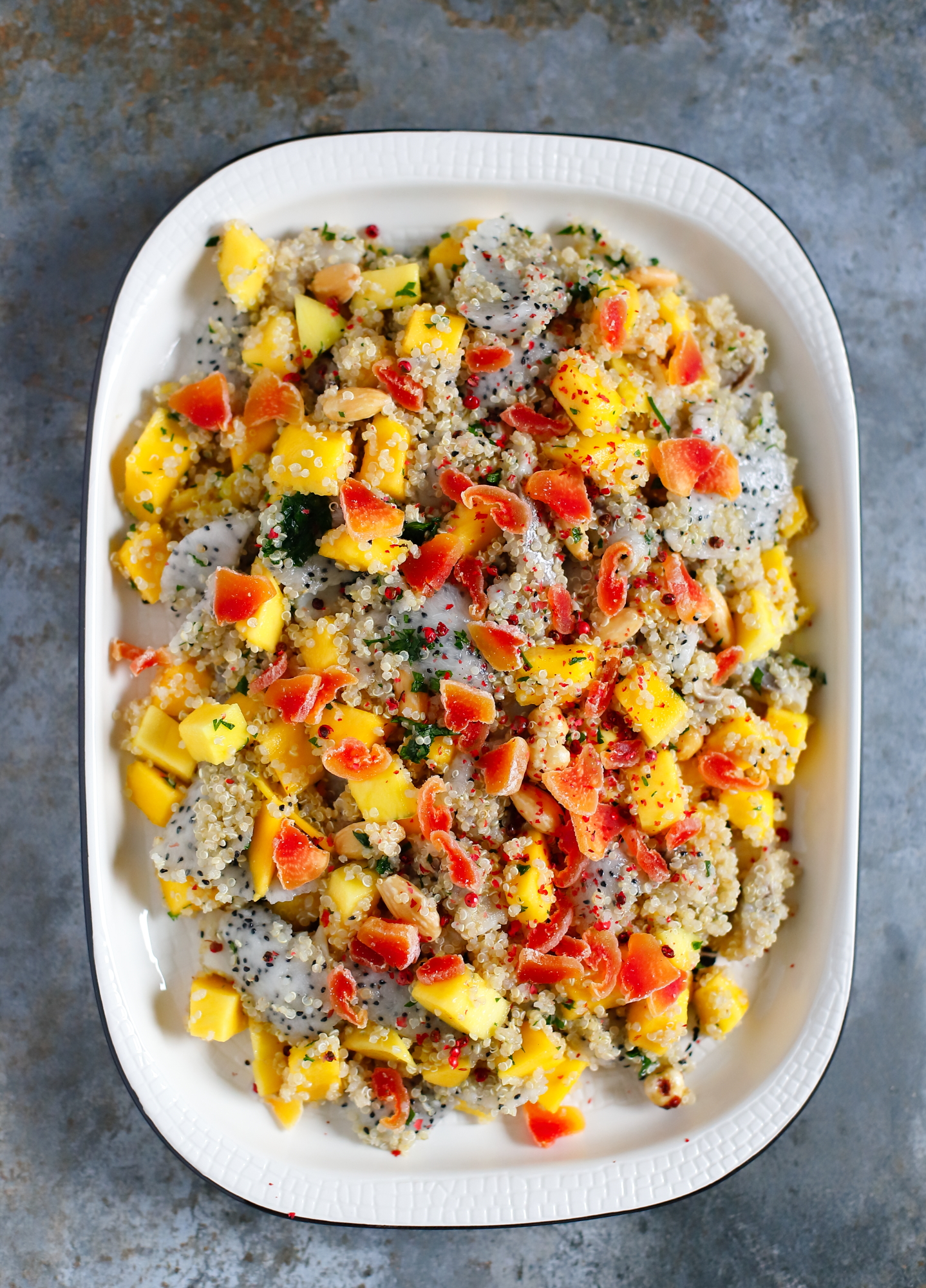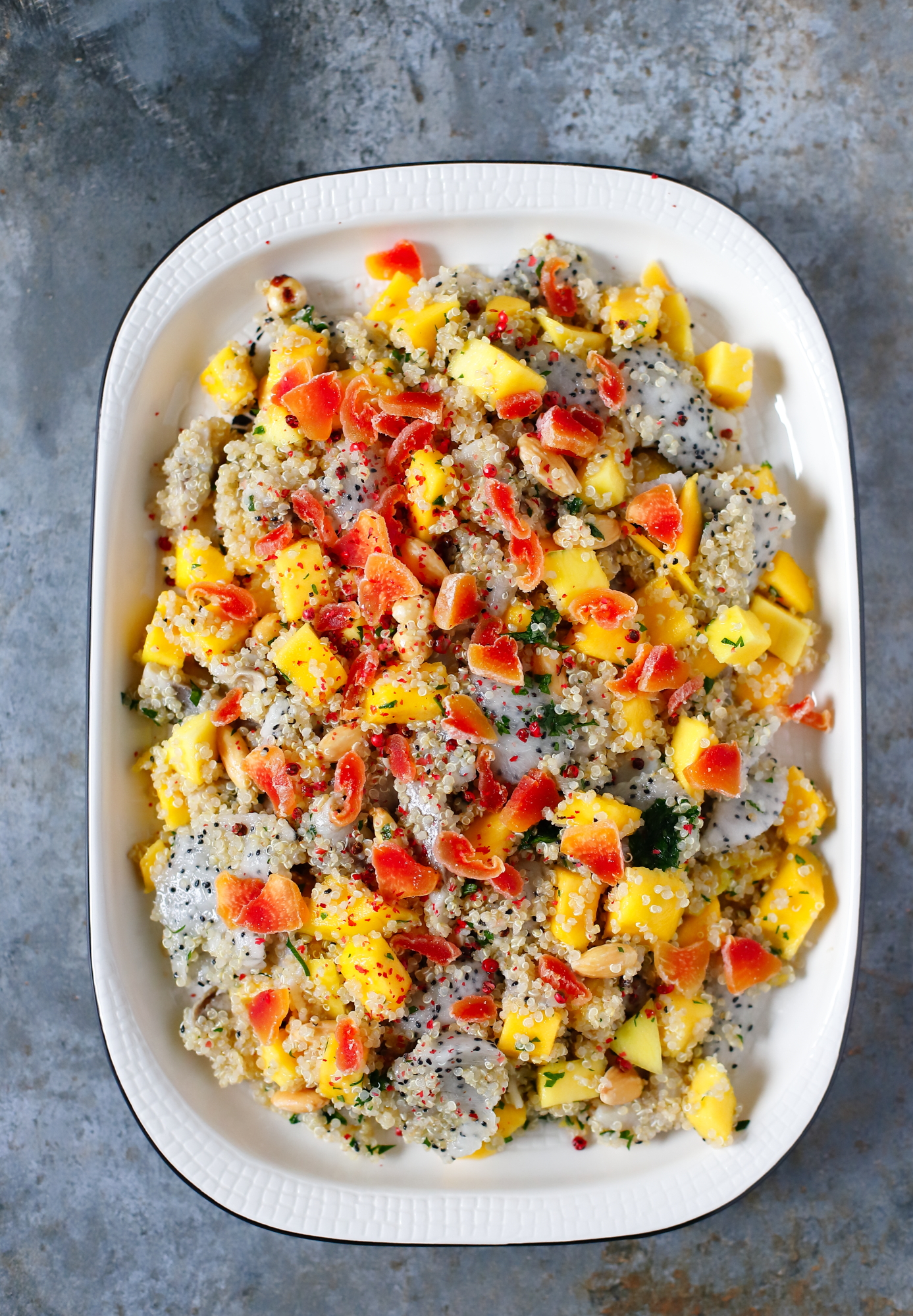 Jeszcze jeden pomysł na tłuściutkie śledzie ze słodkimi owocami. Mango i pitaja świetnie nadają się do śledziowych sałatek, a suszona papaja wzbogaca teksturę i dodaje koloru. W razie potrzeby, zamiast papai dodaj inny suszony lub kandyzowany owoc, najlepiej w jakimś fajnym, wyrazistym kolorze. Używam filetów śledziowych marynowanych w occie, ponieważ ich kwaśny smak dobrze kontrastuje (i jest równoważony) słodyczą owoców. Sałatka będzie jeszcze smaczniejsza, gdy po zrobieniu odstawisz ją na 2-3 godziny, by składniki się „przegryzły”.