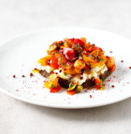 2. W słoiku umieśćcie, po kolei, kilka kawałków podpieczonych w tosterze kromek dobrego pieczywa (tu: ciabatta), a następnie dorzućcie ulubione dodatki, np. kawałek sera (tu: Tomme Noire des Pyrenees), nieco rukoli albo innych zielonych liści, kilka plasterków prosciutto, kilka połówek pomidorków koktajlowych, kawałek dowolnej barwy papryki, a na koniec trochę pestek granatu* do dekoracji.
