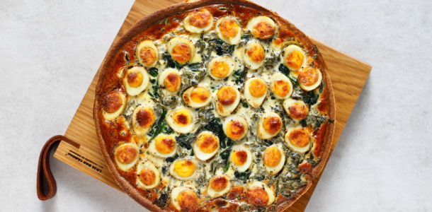 Tarta wielkanocna na kruchym bezglutenowym cieście, ze szpinakiem i jajkami przepiórczymi zatopionymi w kremowym nadzieniu, będzie doskonałym dopełnieniem świątecznego posiłku. Jedna tarta to 6-8 porcji, w sam raz na rodzinne zgromadzenie przy stole.